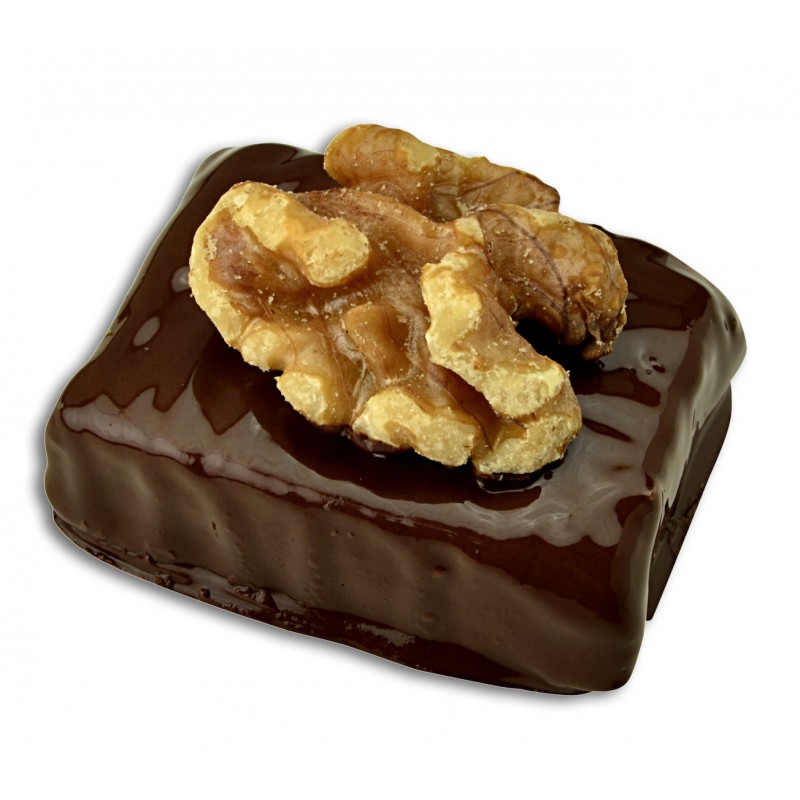 Elaborado a base de turrón natanuez (nata, nuez y almendra) con una cobertura de chocolate y decorado con un trozo de nuez.