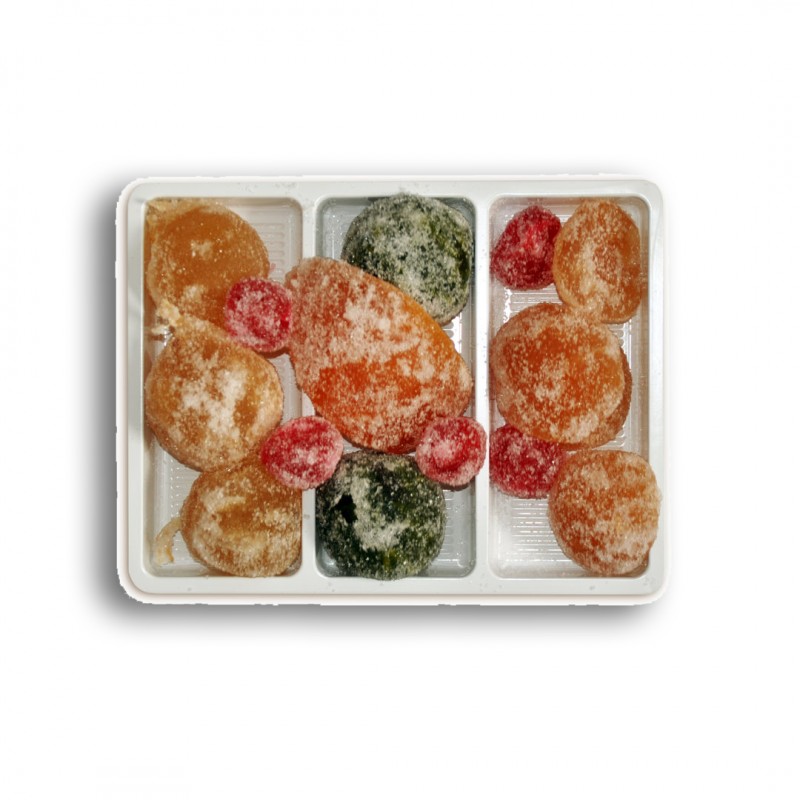 Fruta natural (naranja, ciruela, pera, cereza, albaricoque y calabazate) cocida en almibar y recubierta de azucar.
