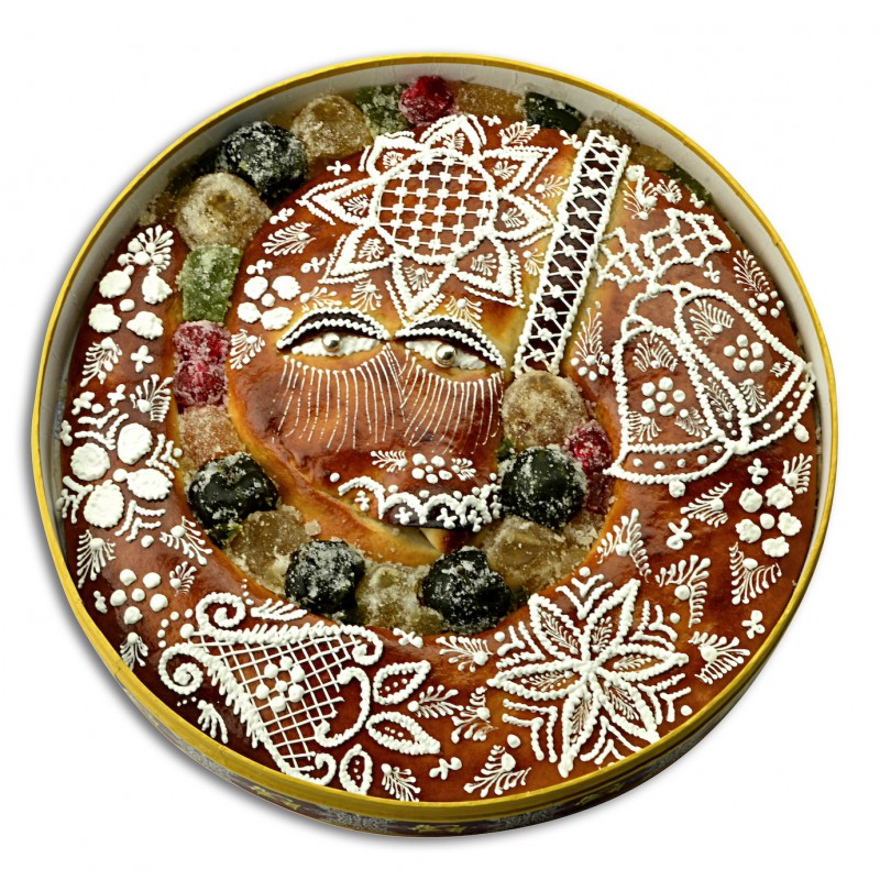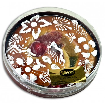 Azúcar, Almendra, fruta confitada [(pera, albaricoque, calabaza, ciruela, cereza) (contiene sulfitos), azúcar, jarabe de glucosa y fructosa, antioxidante: E330, conservador: E202, metabisulfito sódico, colorantes: E100, E120, E133)] huevo, agua, yema de huevo, jarabe de glucosa y fructosa, conservador: ácido sórbico, acidulantes: ácido cítrico y tartrato potásico y espesante: pectina.