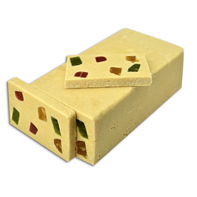 Azúcar, almendra, calabaza confitada (15%min) (calabaza (contiene sulfitos), jarabe de glucosa y fructosa, antioxidante: E330, conservador: E-202, colorantes: E100, E120, E133), agua, jarabe de glucosa y fructosa y conservador: E200. Puede contener trazas de huevo